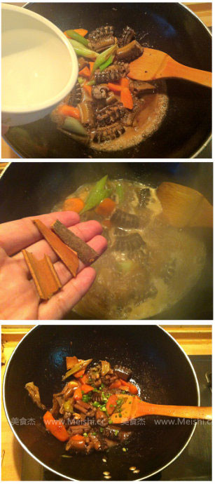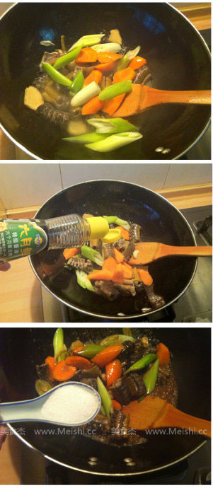 略微翻炒后,將胡蘿卜塊和大蔥一起放入鍋中,加入5湯匙紅燒醬油(醬油的量根據(jù)黃鱔的多少而定,不要放太多以免顏色過重),2湯匙白糖翻炒