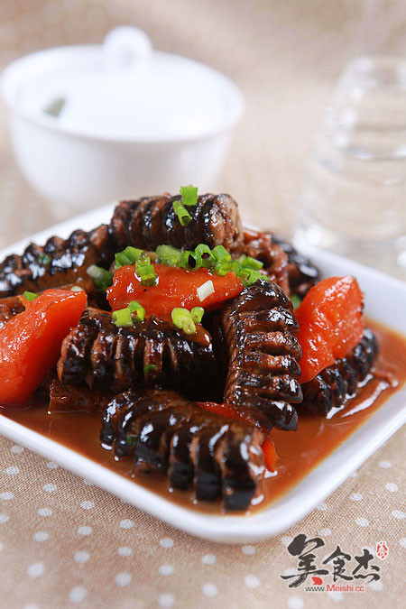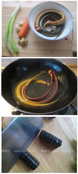 鱔魚:2條; 胡蘿卜: 半根; 蔥:半根;姜:半塊;蒜:1頭;色拉油:適量;食鹽:少許;醬油:5湯匙;料酒:1湯匙;白糖:3湯匙;小蔥:5克;