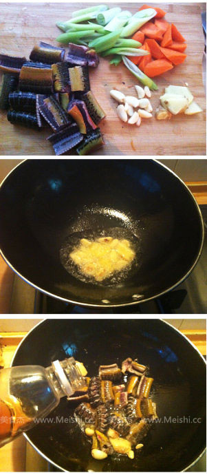 胡蘿卜切滾刀塊,大蔥切段,姜切片,蒜去皮;炒鍋中放油燒熱后放入姜片及大蒜瓣炒出香味,放入切好的鱔段迅速翻炒,調(diào)入1湯匙料酒